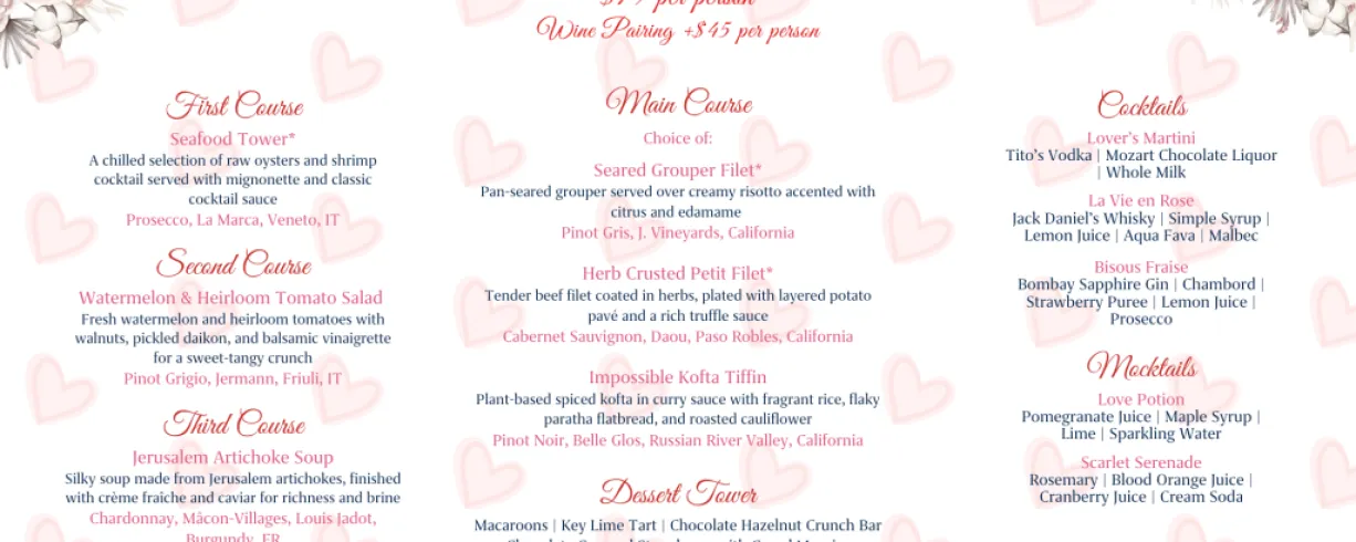 Indulge in an unforgettable Valentine’s Day experience with our exclusive five-course prix fixe dinner, thoughtfully crafted to celebrate romance in every bite. From the first sip to the final decadent dessert, each course blends passion and flavor, showcasing seasonal ingredients, artful presentation, and a touch of culinary magic. Whether you’re toasting new love or rekindling a timeless connection, this candlelit evening promises to be as elegant and unforgettable as the one you share it with. To book: OpenTable - Choose a time for your experience