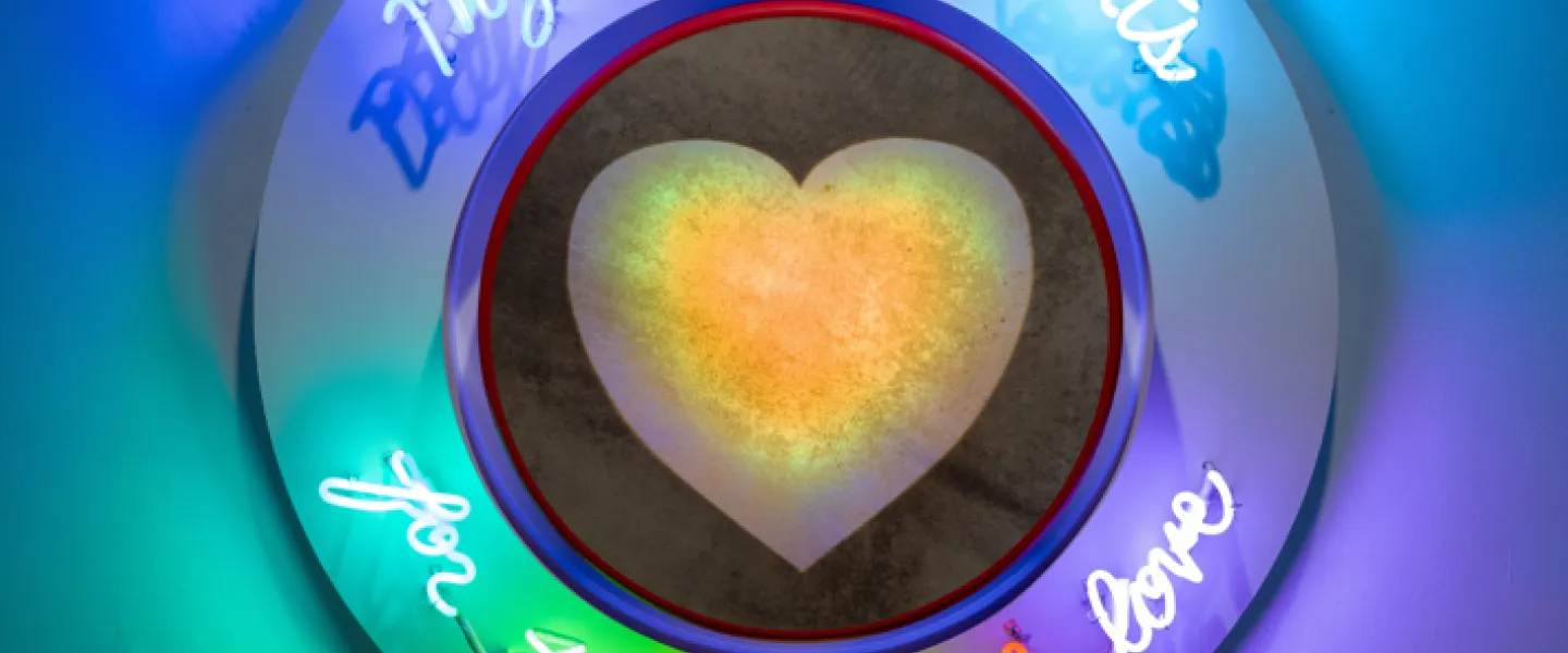 IMAGE: Jeffrey Gibson, My heart beats for the one I love, 2024, Neon and elk skin drum, 37 x 37 x 6 1/2 in., The Phillips Collection, Gift of the Walker Youngbird Foundation, 2025