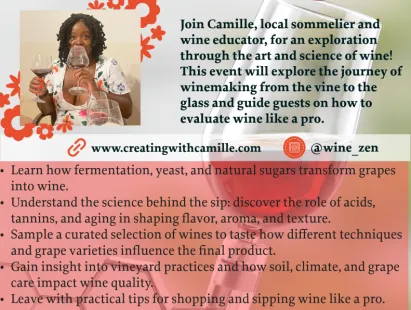 Join Camille, local sommelier and wine educator, for an exploration through the art and science of wine!