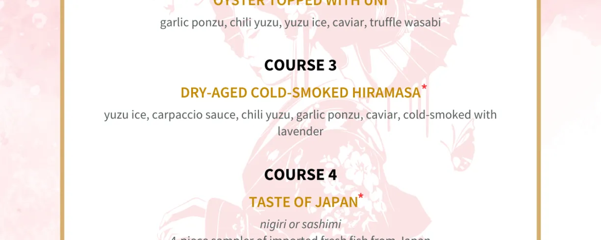 Guests can enjoy a wide selection of our Japanese whiskeys or hand-crafted seasonal cocktails at our 15-seat cocktail bar, or settle into our intimate 10-seat sushi bar for a front-row view of the preparation behind each dish.